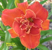 semi-evergreen, diploid, Double 99%, deep coral with red eye above dark green throat