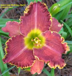 evergreen, tetraploid, fragrant, apple red self with green throat